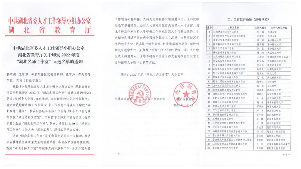 近日,湖北省委人才工作领导小组办公室、湖北省教育厅公布了2022年度“湖北名师工作室”入选名单,QY千亿球友会李立威教授主持的制药工程名师工作室成功入选,同时确定该工作室主持人李立威为“湖北名师”。