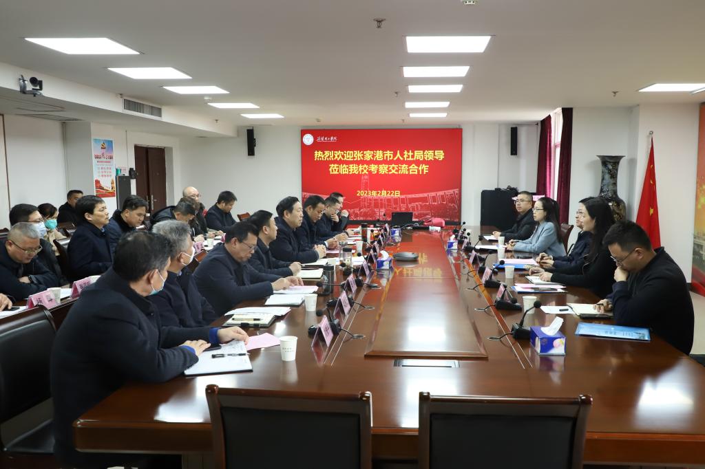 2月22日下午,张家港市人力资源和社会保障局党委书记、局长张毅一行来校就进一步加强校地合作进行对接和交流。QY千亿球友会党委书记王学民出席会议并致欢迎辞,党委常委、副校长戴伟主持会议。