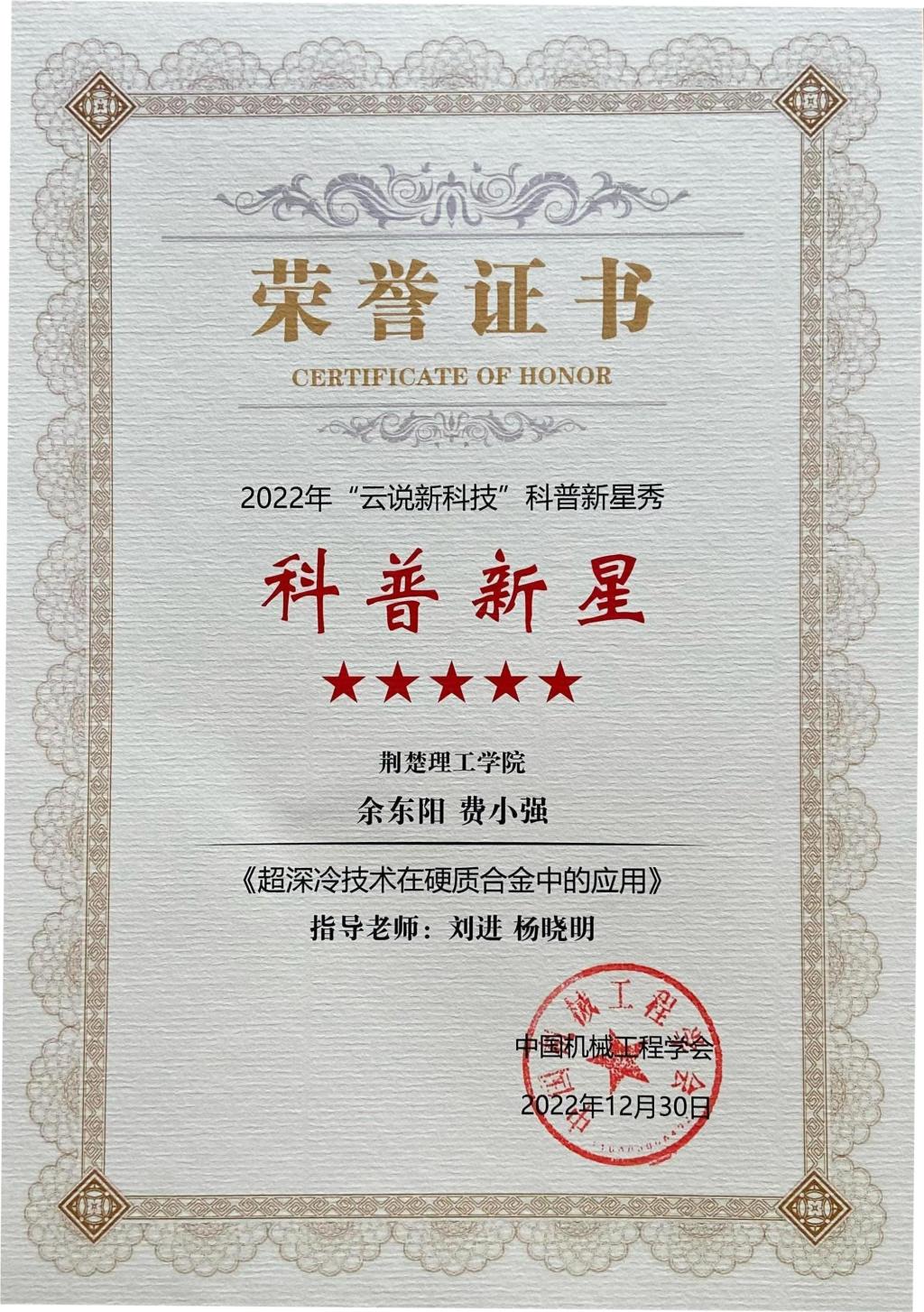 近日,在2022年“云说新科技”科普新星秀全国大赛中,QY千亿球友会学子的参赛作品《超深冷技术在硬质合金中的应用》斩获大赛最高奖“科普新星(五星)”。获奖作品由机械工程学院学子余东阳、费小强(指导教师:刘进、杨晓明)带领极端条件材料实验室(LECM)团队完成。