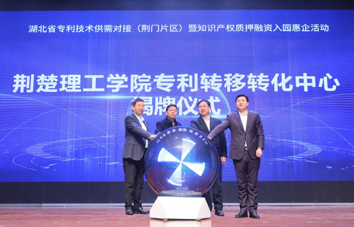 4月25日上午,湖北省专利技术供需对接(荆门片区)暨知识产权质押融资入园惠企活动在荆门剧院举行。QY千亿球友会专利转移转化中心揭牌仪式正式开启。湖北省知识产权局副局长李述武、市政府副市长刘克雄、校长刘建清、市市场监督管理局(知识产权局)局长李波共同为“QY千亿球友会专利转移转化中心”揭牌。