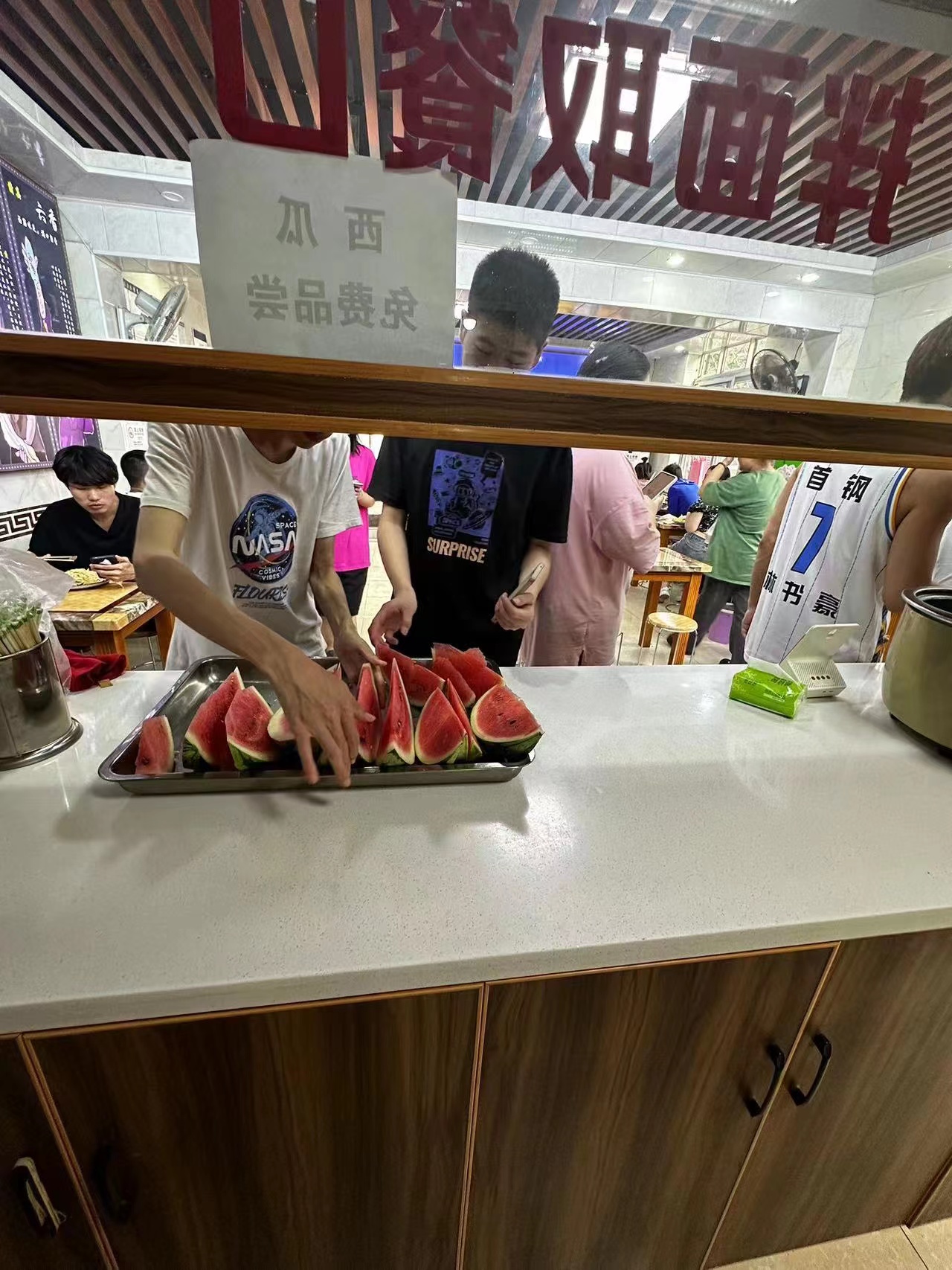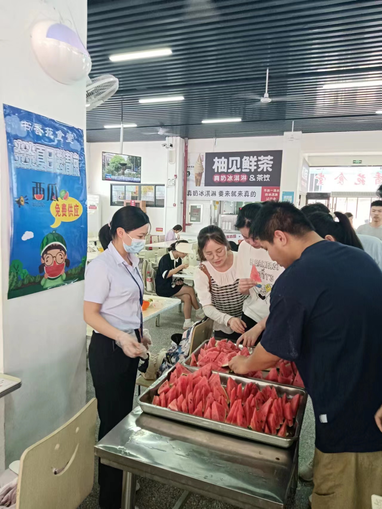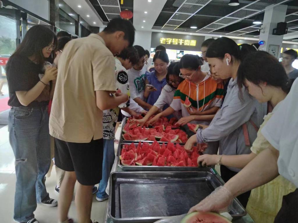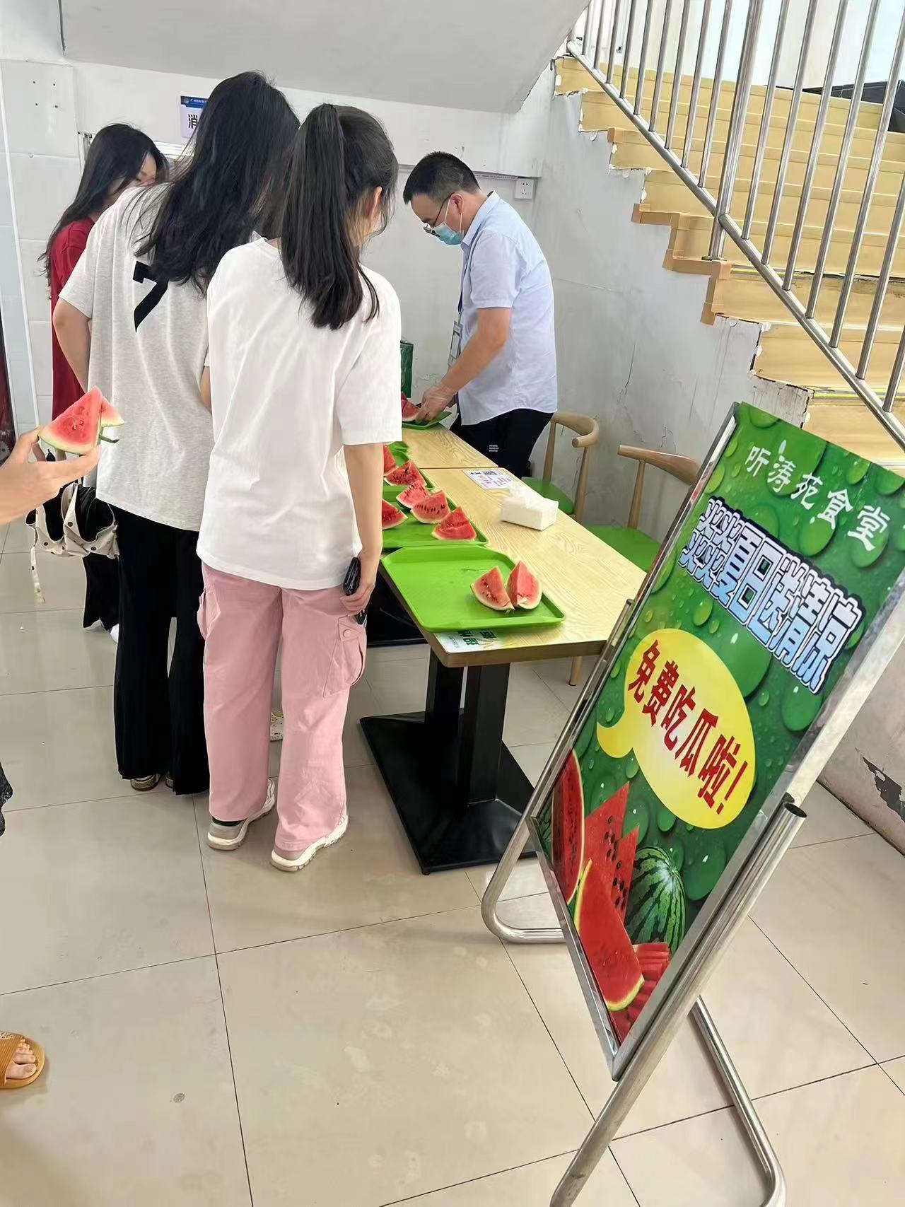 当天一早,石鼓村新鲜香甜的大西瓜被运输车缓缓载入校园各大食堂,为了让学生能够尽快吃上西瓜,食堂工作人员迅速忙碌了起来,清洗切好再装盘,分别在白龙山食堂、听涛苑食堂、书香苑食堂、清真内食堂设置了西瓜免费享用点。一名同学高兴的说:“充满荆楚情味的西瓜真可口,不仅消暑降温,还为即将毕业的我们离校愁绪添加了暖心的甜意。”学生们吃着清凉美味的西瓜,深切的感受着学校对他们的关怀。
