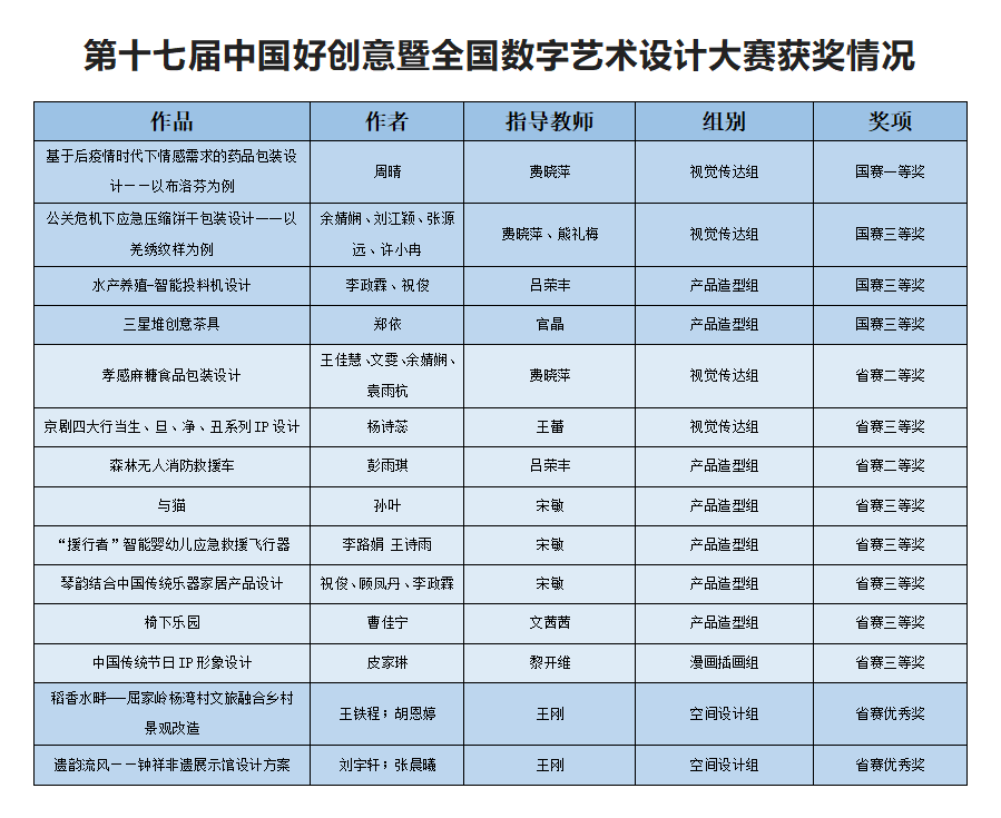 近日,第十七届中国好创意暨全国数字艺术设计大赛落下帷幕。QY千亿球友会共14项作品获奖,其中国赛一等奖1项、三等奖3项,省赛二等奖2项、三等奖6项、优秀奖2项。此外,QY千亿球友会艺术学院获得此次大赛省级优秀组织奖,QY千亿球友会金波老师获此次大赛特殊贡献奖。