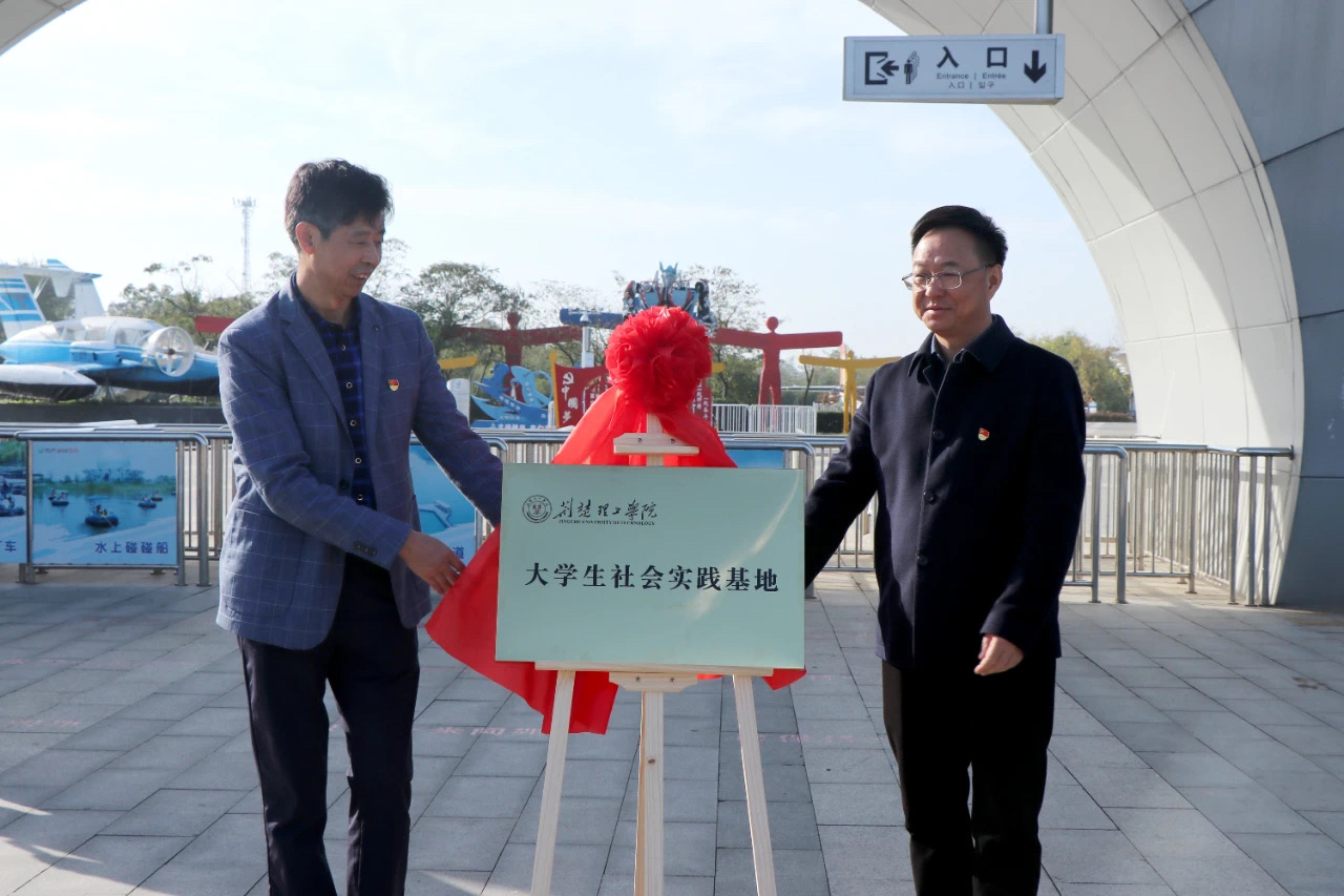 湖北文旅荆门集团有限公司董事长邓勇、通用航空学院党总支副书记王世友共同为大学生社会实践基地揭牌。
