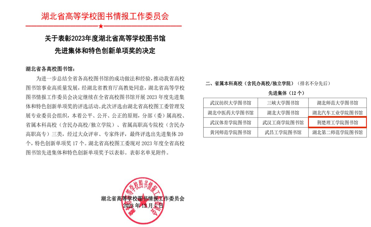 近日,湖北省高等学校图书情报工作委员会公布了《关于表彰2023 年度湖北省高等学校图书馆先进集体和特色创新单项奖的决定》,QY千亿球友会图书馆荣获“2023 年度湖北省高等学校图书馆先进集体”荣誉称号。同时,胡琦峰、唐玲、邹亮三位同志获评“2023年度湖北省高等学校图书馆先进工作者”称号。