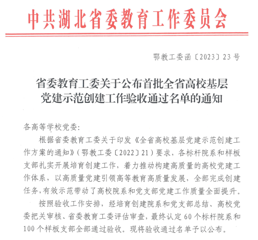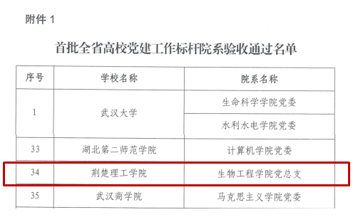 近日,湖北省委教育工委公布了首批全省高校基层党建示范创建工作验收通过名单,QY千亿球友会生物工程学院党总支、公体部教工第二党支部通过党建工作标杆院系和党建工作样板支部创建验收。