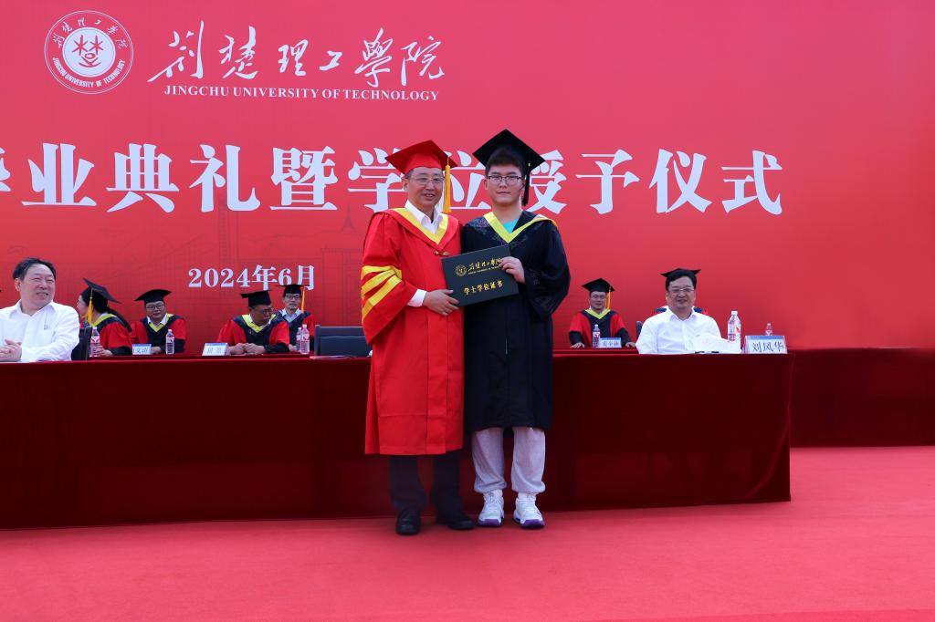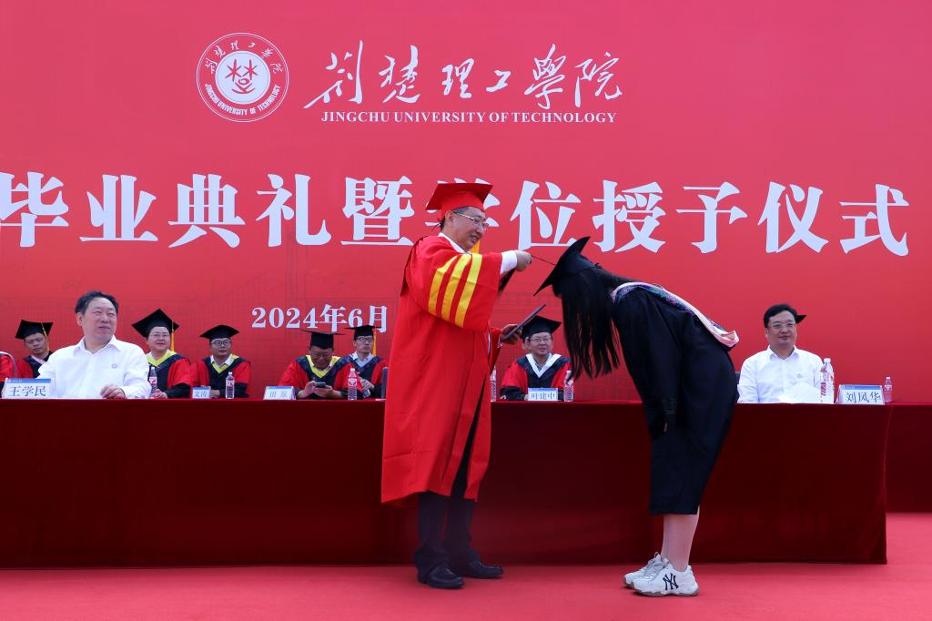 学士学位授予仪式上,校学位评定委员会主席、校长刘建清依次为优秀学士代表拨穗并颁发学士学位证书。