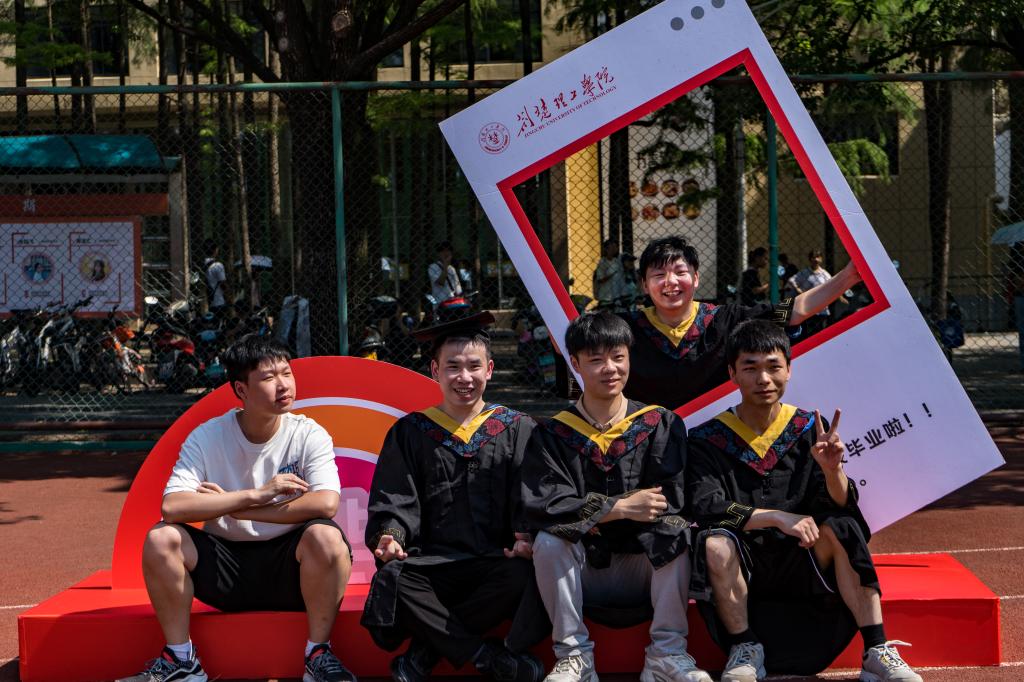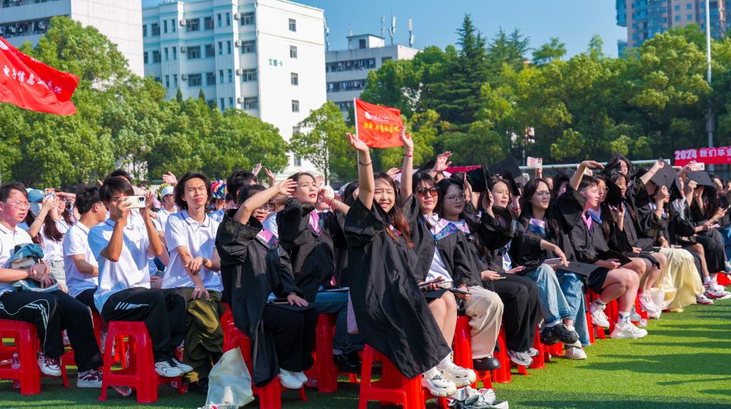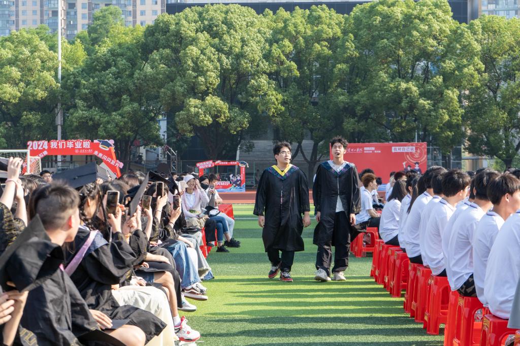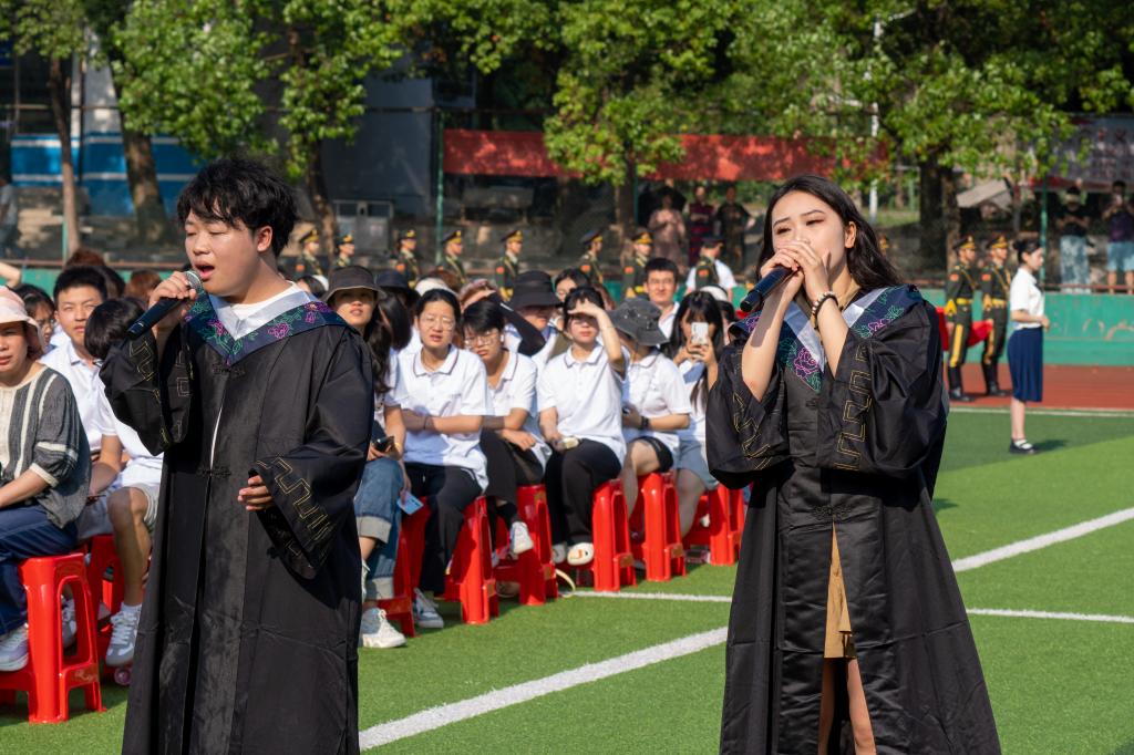 “我曾将青春翻涌成她,也曾指尖弹出盛夏……”操场上高高矗立“毕业龙门”和“致青春合影框”,人声鼎沸,热闹非凡。典礼开始前,现场播放了学校为毕业生们精心制作的毕业寄语视频,向毕业生们送上美好的祝福,学生代表们深情演唱歌曲为毕业典礼暖场,歌声中既回荡着学子们对校园美好时光的深深留恋,又满载着他们勇敢迈向未来、追寻梦想的决心与憧憬。伴随着欢快的音乐声,大家在毕业签名墙上签下自己名字,写下对青春的寄语和对母校的祝福。