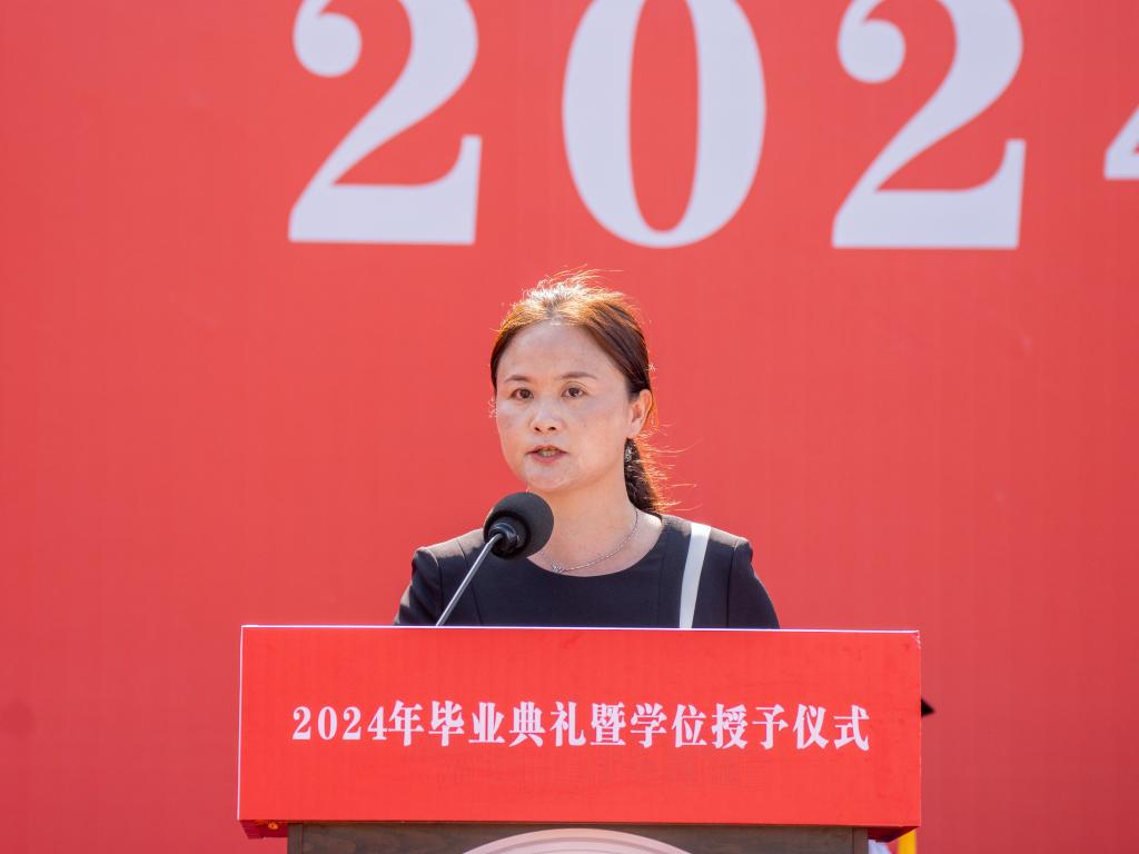 在校生代表、文学与传媒学院龚庆红追忆与学长学姐相伴的匆匆时光,向他们表达由衷的祝愿,她将接过青春接力棒,续写荆楚理工新篇章。