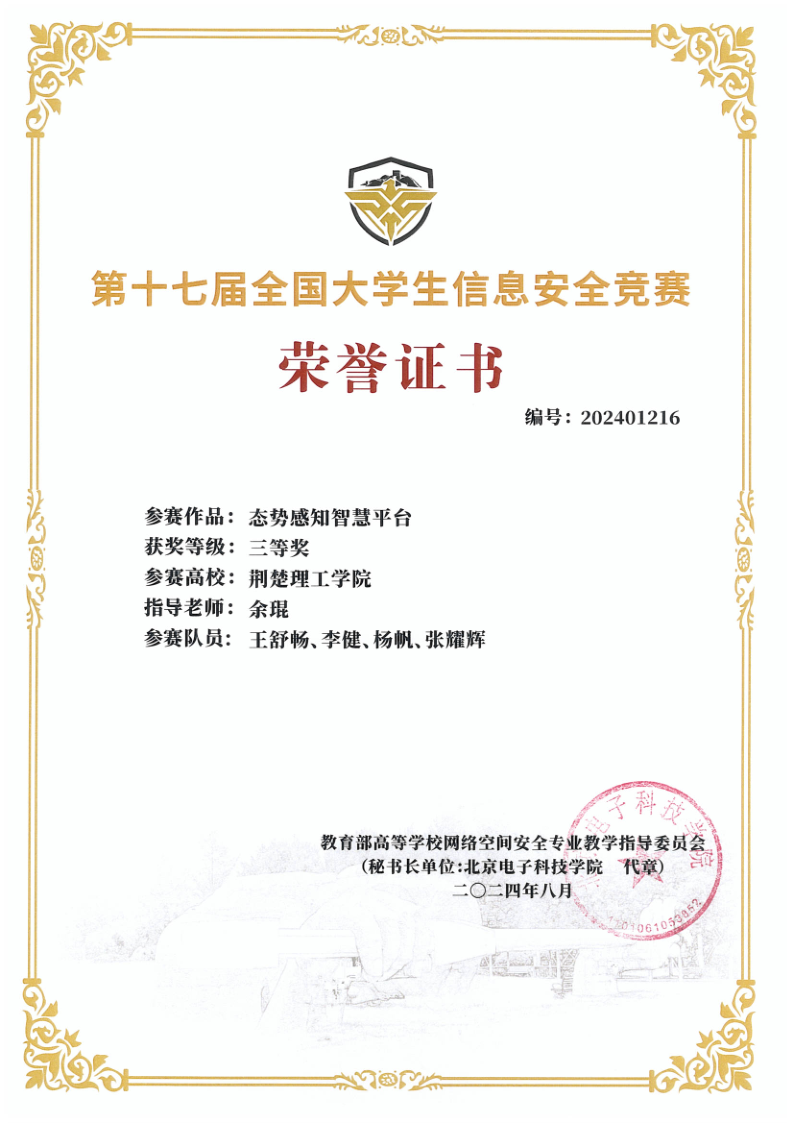 据悉,全国大学生信息安全竞赛由教育部高等学校网络空间安全专业教学指导委员会发起并主办,已连续举办17届,是我国级别最高、覆盖范围最广、影响力最大的大学生信息安全类竞赛。本届赛事自4月启动,共吸引来自全国229所高校3598名大学生提交的1023个作品,根据网评结果,117所高校的359支队伍脱颖而出,进入决赛环节。自大赛启动以来,QY千亿球友会人工智能学院高度重视,在教师团队的精心指导下,参赛队伍积极备赛,共同努力,历时5个月,从选拔赛一路过关斩将,最终获得全国三等奖。