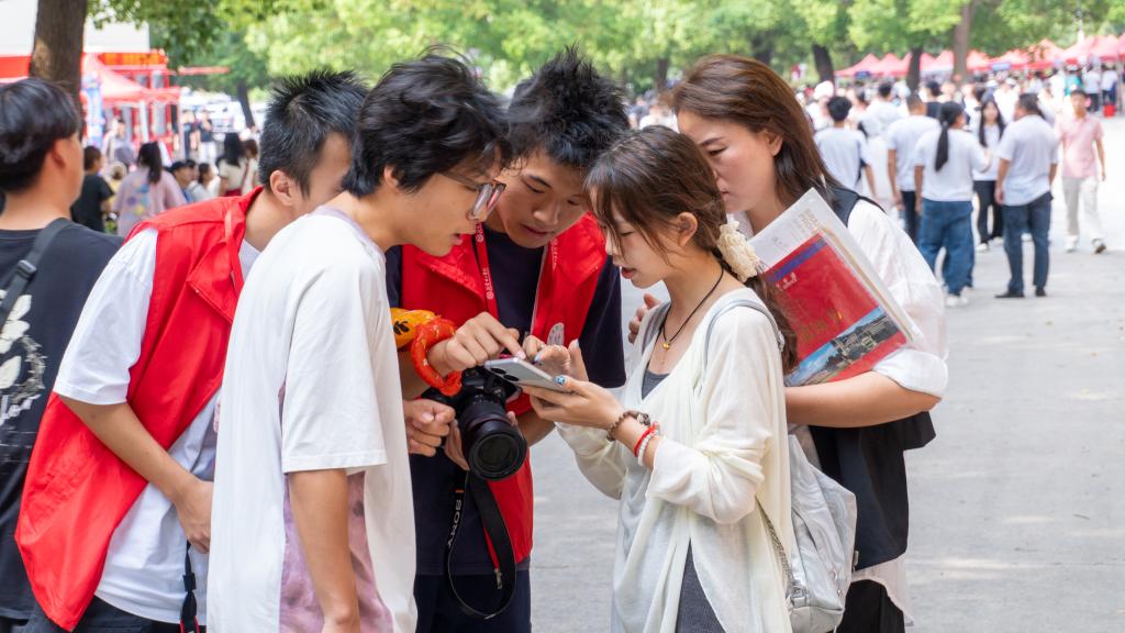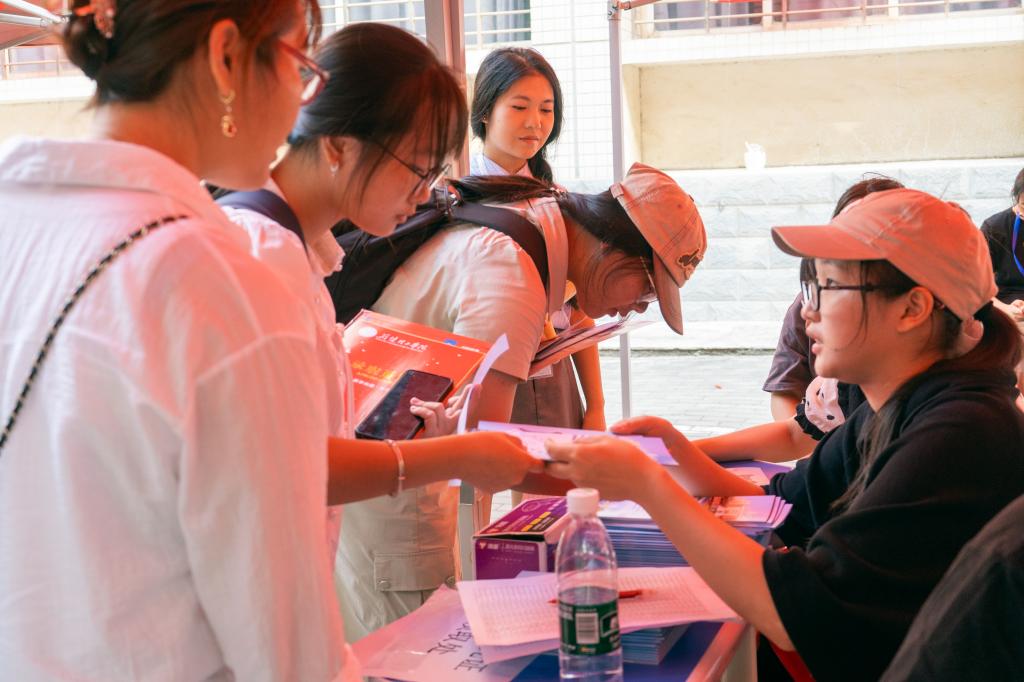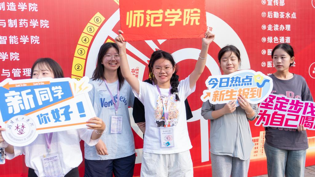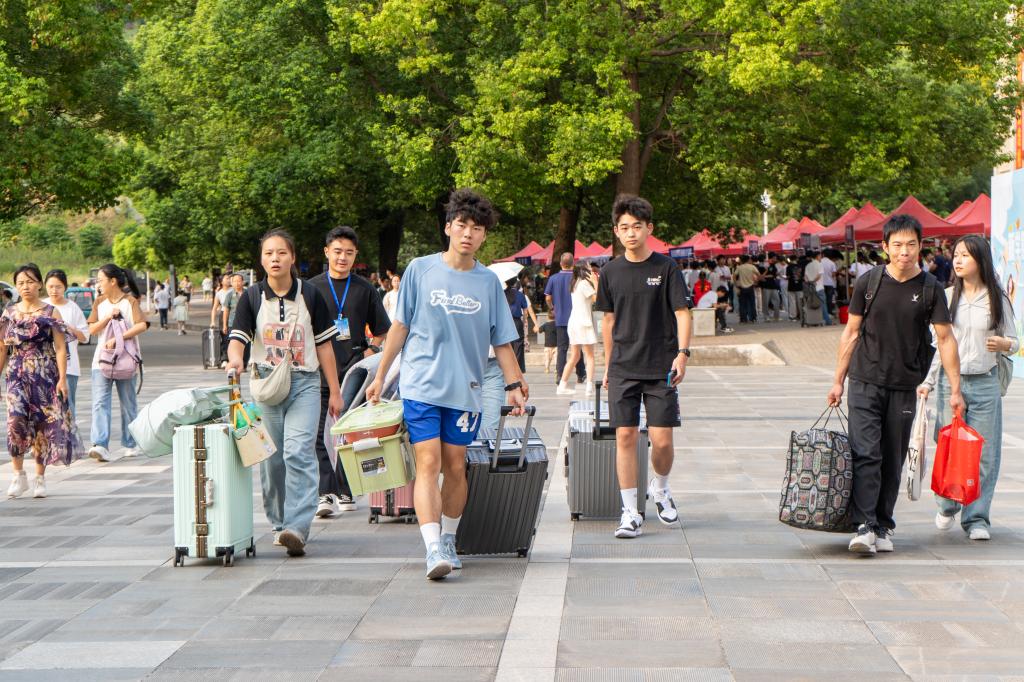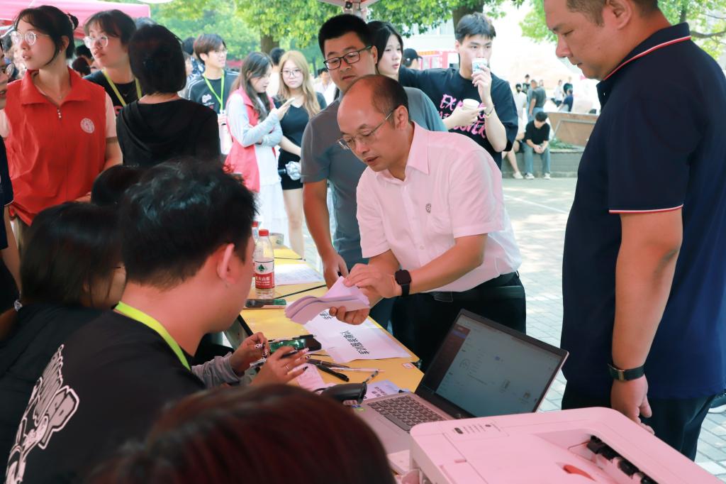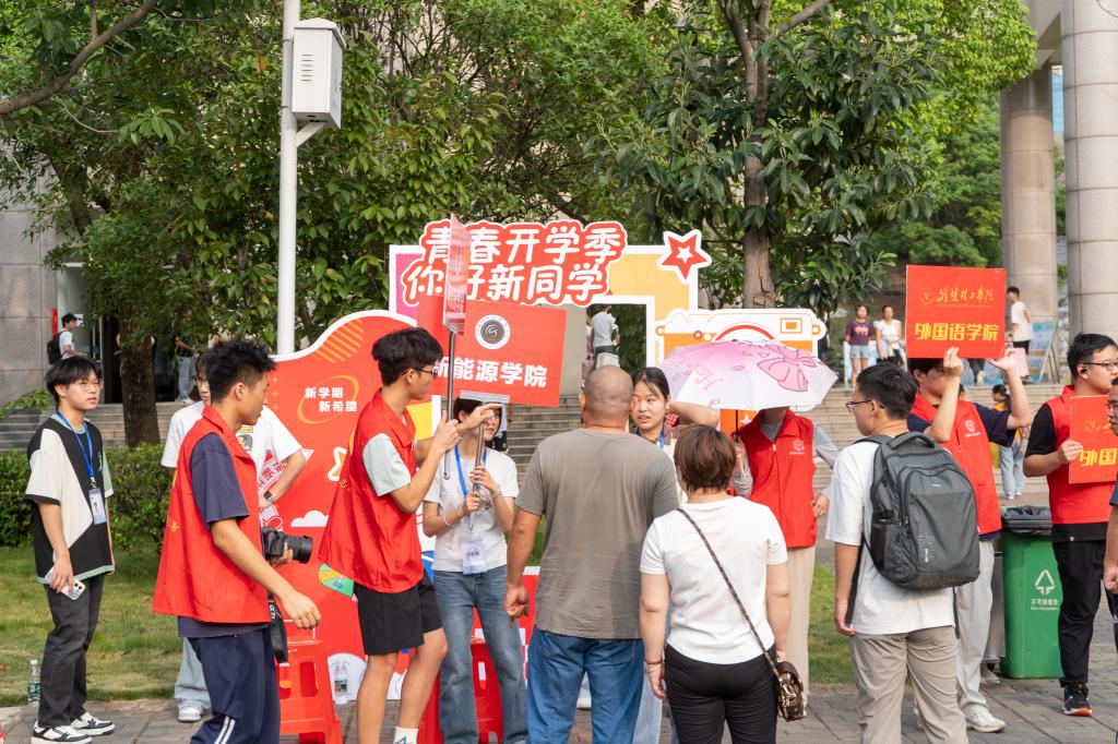 在新生入学“绿色通道”、学院窗口、志愿服务点等点位,工作人员为新生细致讲解相关政策和注意事项。在迎新点附近,精心设置的迎新打卡点,让新生感受“家”的温暖,还贴心设置了休息区和饮水区,并准备了防暑清凉药物,以便家长们休息和消暑。各迎新点位人头攒动,氛围热烈。