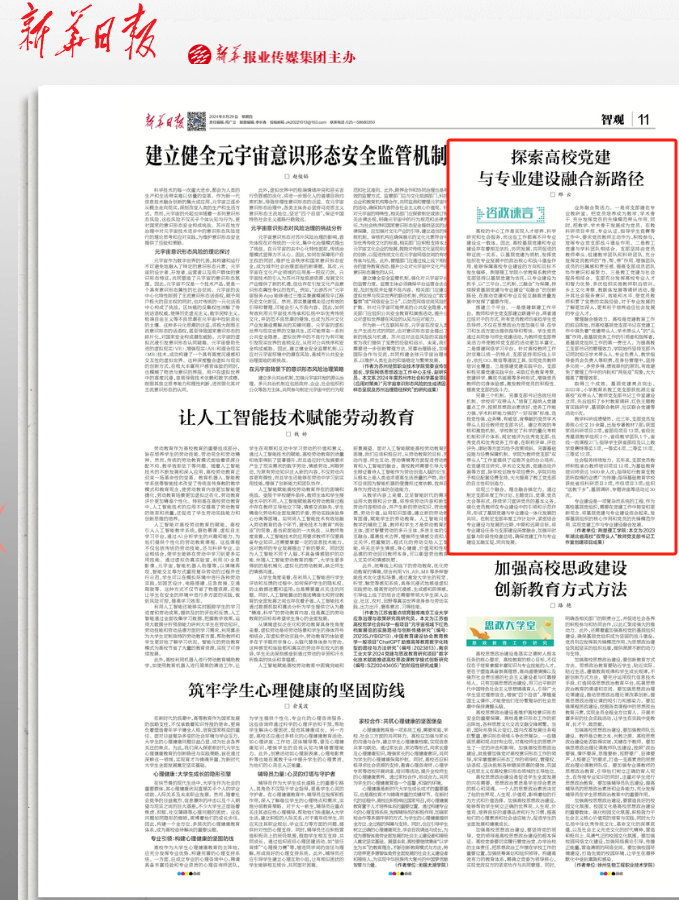 8月29日,《新华日报》第11版(理论版)“智观”刊发了QY千亿球友会师范学院小学教育系教工党支部书记邢云撰写的理论文章《探索高校党建与专业建设融合新路径》。文章展示了QY千亿球友会借力党建工作,促进专业高质量发展的深度思考。