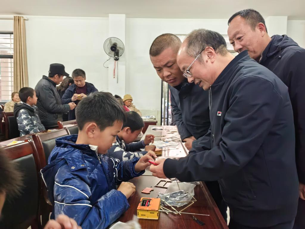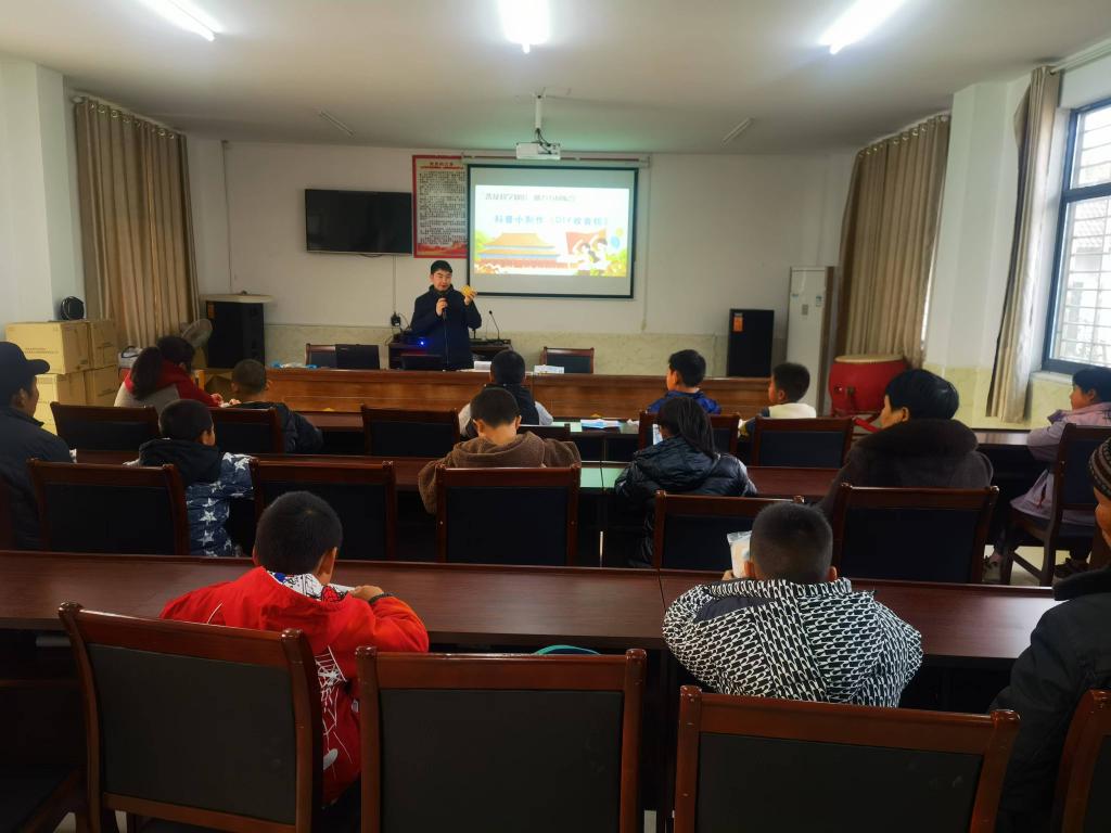 在村委会会议室,2008届电子专业校友、荆门探梦科技有限公司总经理余为伟为该村留守儿童讲授公益科普知识。张友兵步入课堂,指导孩子们完成科技小制作,赠送科技大礼包,并激励孩子们热爱科学,积极探索创造,树立远大理想,长大后做对社会有用的人。