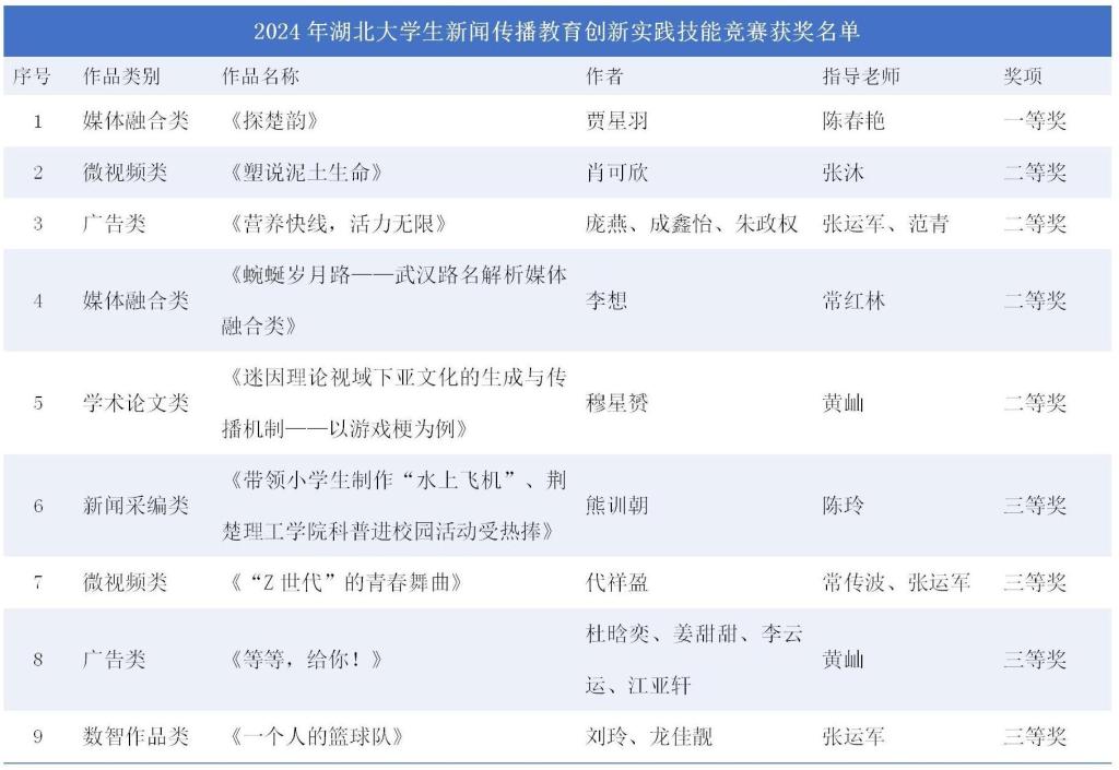 近日,2024年湖北大学生新闻传播教育创新实践技能竞赛公布结果,QY千亿球友会文学与传媒学院学子共斩获9个奖项,一等奖1项,二等奖4项,三等奖4项。