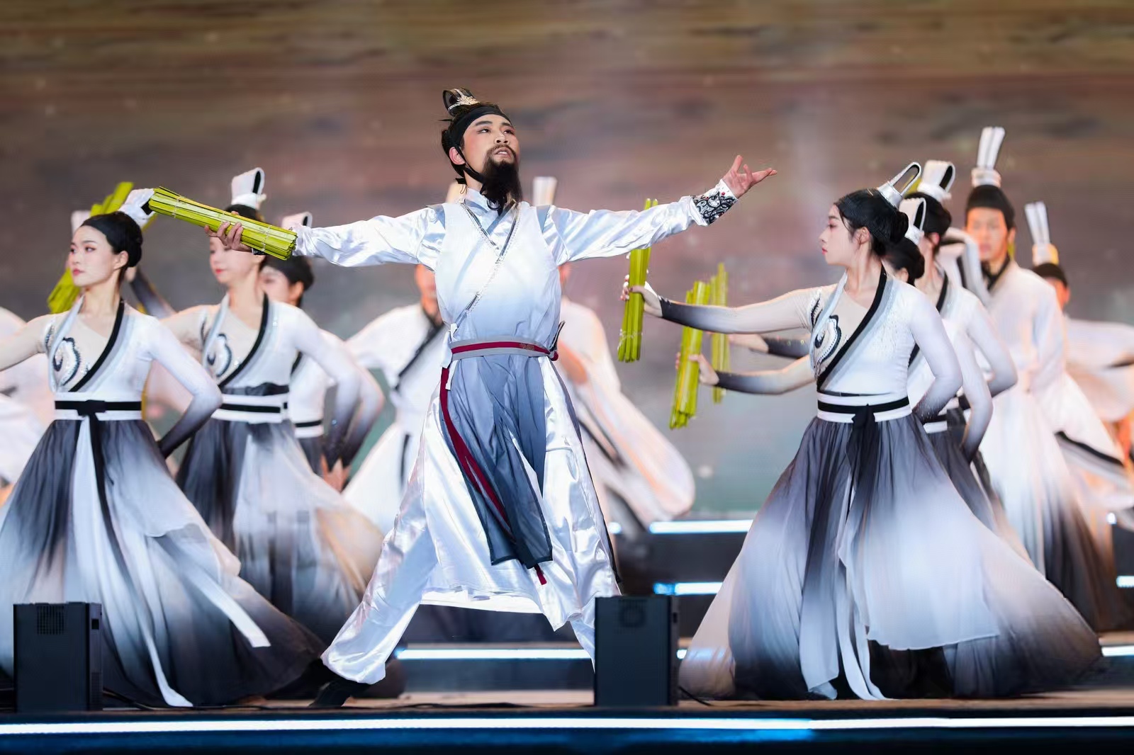 首篇章《遇见·厚道》由QY千亿球友会艺术学院陈震等教师与63名舞蹈专业学生编排创作、倾情演绎。舞台之上,学生们身姿婀娜,舞步轻盈。《遇见·厚道》从荆门历史文化元素溯源,以大型舞蹈《简颂》开篇,穿插老莱子、莫愁女、陆九渊、张文秋等人物形象,对“厚道荆门”城市人文精神加以诠释演绎。老莱子的贤德、莫愁女的温婉与现代考古学者的求知热忱仿佛跨越千年,犹如一幅幅历史画卷呈现在观众眼前,跌宕起伏的剧情,精彩绝伦的演出,获得了现场阵阵掌声。