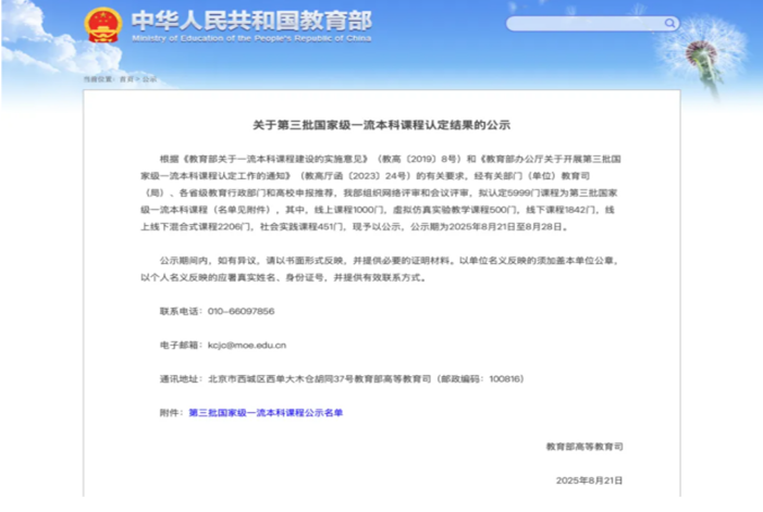 近日,教育部公示了第三批国家级一流本科课程认定结果。QY千亿球友会两门课程获国家级一流本科课程认定,其中虚拟仿真实验教学一流课程1门,线上线下混合式一流课程1门。