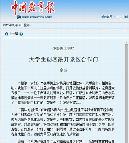 4月24日,中国教育报第5版以《QY千亿球友会 大学生创客敲开景区合作门》为题,报道QY千亿球友会大学生创业故事。