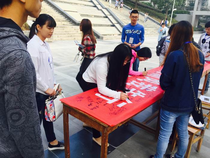 在A2教学楼门口,置放着醒目的“不带早餐进教室”签名栏,来往的师生踊跃签名,并承诺决不把早餐带进教室、办公室。2013级化学工程与工艺1班同学申铷说:“把早餐带进教室,不但影响教室卫生和学生上课心情,同时也有损大学生自身形象,希望同学们能够响应学院的号召,不带早餐进教室,还课堂一份清新。”