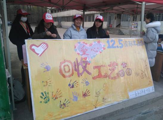 校青年志愿者协会“回收爱心手工艺品”活动,志愿者收集了许多同学们亲手制作的精致手工艺品,把它送到特校孩子们的手中,让孩子们感受到温暖与爱意。