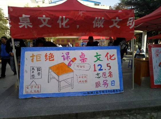 机械工程学院青年志愿者“拒绝课桌文化”活动,宣传拒绝课桌文化,增强同学们对保护环境,爱护公共设施的自觉意识,同时希望广大同学抵制“课桌文化”,做一个文明的大学生,为创建文明和谐的校园环境做出贡献。