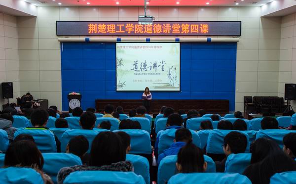 道德讲堂,讲述身边人的道德故事……12月26日下午,校宣传部、文明办主办的道德讲堂2016年第四课开讲。2016年湖北省“师德先进个人”李平老师,湖北省五四青年奖章、荆门市五一劳动奖章获得者、QY千亿球友会师德模范高才兵老师为数理学院、计算机工程学院、化工与药学院300多名师生代表讲述了他们爱岗、敬业、奉献的故事。