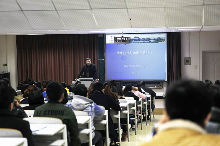 黎厚斌教授从纳米技术与包装的关系、包装印刷领域中的纳米技术的思考与展望、纳米技术在包装印刷领域应用遇到的问题等三个方面展开讲述。黎教授结合自身的科研,为师生介绍了RFID智能标签、控温膜、TTI指示标签等先进技术。他以生动平实的语言为在座师生普及了纳米技术的系统知识,也使大家对印刷包装专业有了全新的认知。