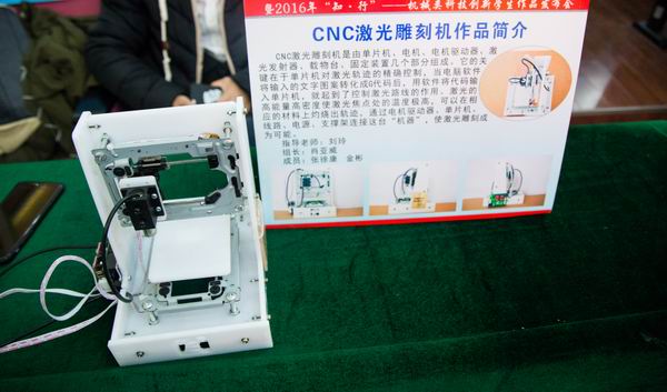 作品发布会围绕建设“资源节约型、环境友好型”社会主题创意设计,展出了六足机器人、DIY智能小车、半导体制冷器、太阳能水陆两栖车、CNC激光雕刻机、干燥衣柜、自平衡小车、变压太阳能电池板等12件学生科技创新作品。12组科技创新团队从制作背景、设计思路、思路来源、制作用途、应用前景、创新点等各个方面对本小组作品作了详细介绍。经评委评审,CNC雕刻机荣获一等奖,捶式破碎机和自平衡小车获得二等奖,六足机器人、DIY智能小车、太阳能水陆两栖车获得三等奖,六足机器人、半导体制冷器、变压太阳能电池板、水火箭、DIY电磁炮、简易起重运输机获得优秀奖。此外,机械工程学院教师刘玲、杨荣强、姜海翔、胡琦峰、古晓林、刘清华、郑玲获得优秀指导老师奖。