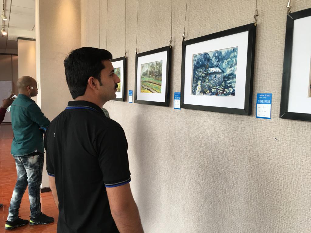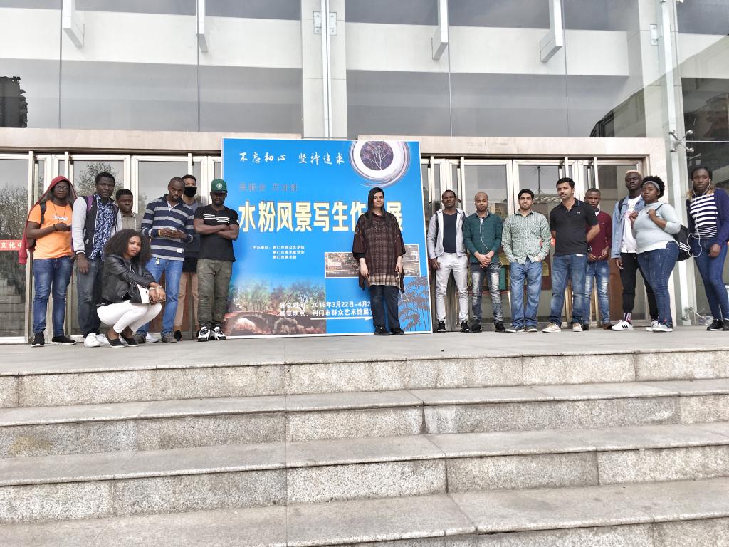 3月28日,来自印度,巴基斯坦,孟加拉等10多个国家的国际学生,在老师的带领下,来到荆门市群众艺术馆,参观了吴振全、万沐胜老师的水粉风景写生作品展。学生们饶有兴趣地欣赏一幅幅展现荆门人文山水的精美作品,深入交流探讨每幅作品的特点,深感受益匪浅,进一步加深了对中国文化的了解,上了一堂生动的中国文化实践课。